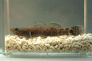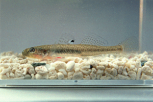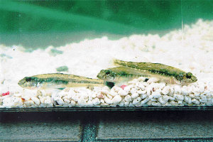 十杷ひとからげにしてビリンゴと呼んでいた けれど、その中にちゃんと本物のビリンゴも 混じっていた。体の側面にくっきりと浮かぶ 一筋の黒い点線。ずんぐりした感じの背鰭と 尻鰭。尾鰭の端は直線的に切れ上がっている。 穴蝦蛄の巣穴を利用して産卵しているらしい。 |