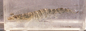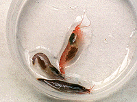 10:15に勝島橋へ。赤潮はすっかり落ち着いたようで、水は澄み 膝くらいの水深があっても水底まではっきり見通せる。水温を測れば 28℃と、これも夏場にしてはいくらか落ち着いた感じ。けれど護岸の 裁ち上りを探ってみてもさっぱり何も入らない。護岸の端から端まで 一通り探ってやっと、魚少と真沙魚が3尾ずつに蚯蚓沙魚が1尾だけ。 さらに潮が引いてきたら、護岸の干出面を見て回る。見つかったのは 鶏冠銀宝が7尾に韋駄天銀宝が1尾。鶏冠銀宝も韋駄天銀宝も軒並み 卵に寄り添っている。卵を守っていなかったのは鶏冠銀宝の2尾だけ。 この卵を守っていない鶏冠銀宝のうち、1尾を選んで身体の大きさを 測ってみると6cm。卵を守っているものと、大差は無いように見える。 ●勝島橋 28℃ 2.0% 真沙魚 3尾 47,63,78mm 魚少 3尾 28,35,51mm 蚯蚓沙魚 1尾 43mm 鶏冠銀宝 7尾 60mm1尾、他未計測。卵あり5尾。 韋駄天銀宝 1尾 未計測。卵あり。 11:15にはしおじ磯へ。潮が上がって来る前に干出部を見て回り、 潮が上がり始めてからはごろた石の間を蹴り込んでゆく。蚯蚓沙魚が 4尾に泥目が1尾、真沙魚と魚少が2尾ずつと、あまり見つからない。 魚少のうち小さい方の1尾は、沼魚少のように見えなくもないけれど、 かと言って沼魚少と断定するだけの決め手にも欠ける。微妙だなぁ〜。 やがて膝くらいの水深になった土留めの裁ち上りを蹴り込んでいると、 指長筋蝦が多い中に2尾、見慣れない模様の蝦が網に入った。身体は 全体的に透明で、腹部には黒い横筋がくっきり。鋏脚の関節が黄色く、 掌部が青く色付いて、なかなか綺麗な感じ。もう何年も前に一度だけ 埠頭の南で見つけたことのある脚長筋蝦に似ているような感じがする。 けれど額の角は短くて、上に反らずほぼ真直ぐ。腹部にある筋模様も 節々の後端のみにあり、中でも3本目の筋が一際くっきりとしている。 また、腹部の脇も筋状に黒く色が着いている…ってことは筋蝦擬かぁ。 今まで筋蝦擬だと思っていた蝦のうち、多くは幼い手長蝦か色の薄い 指長筋蝦だと思われるけれど、この2尾は正真正銘の筋蝦擬のようだ。 ●しおじ磯 29℃ 2.0% 真沙魚 2尾 95、97mm 魚少 1尾 81mm 沼魚少 1尾 50mm 蚯蚓沙魚 3尾 46、65、66mm 泥 目 1尾 67mm 筋蝦擬 2尾 15:30には管理事務所へ。明日の干潟観察会に誘われているので、 時間等を間違えないよう改めて確認。管理事務所のOさんと話す中で、 淡水池からの流れ出しにまたぞろ蟹が集まっていると聞く。さっそく 見に行くと、暗渠の中にいるわいるわ鋏も立派な黒弁慶蟹がぞろぞろ。 明日の観察会用に2匹だけ捕まえ、バケツへ入れて蓋をして確保する。 |