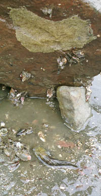 朝晩はかなり涼しくなったけれど、日中となるとまだまだ真夏の暑さ。 それでも下げ止まりの時刻は、刻一刻と早くなってきた。9:50に 勝島橋の袂に着いて、さっそく護岸の裁ち上りを探り始める。けれど 季節の変り目を察知したのか、真沙魚が7尾に安倍沙魚が1尾だけと 寂しい限り。護岸の鶏冠銀宝は4尾のうち卵を守っていたものは2尾。 ●勝島橋 27℃ 2.3% 真沙魚 6尾 96,107,123,125,129mm各1,未計測1尾 安倍沙魚 1尾 17mm 鶏冠銀宝 4尾 未計測 卵あり2尾 11:00になったらしおじ磯へ。まず立ち込んで石の下を蹴り込む。 真沙魚と泥目が1尾ずつ入る。一緒に入る指長筋蝦は3cmそこそこの 大きさのものばかりだけれど、腹に卵を抱えているものも少なくない。 春に卵を抱えているものは4〜5cmくらいあることからすれば、春に 産れたものがすっかり成長し、卵を持つようになったのかも知れない。 干出部で石を起して回ると、安倍沙魚が2尾に蚯蚓沙魚が10尾ほど。 ●しおじ磯 29℃ 2.4% 真沙魚 1尾 94mm 泥 目 1尾 85mm 安倍沙魚 2尾 26mm1尾、20mm未満1尾 蚯蚓沙魚 11尾 51〜68mm 53,54mm各3、51mm2尾 |
