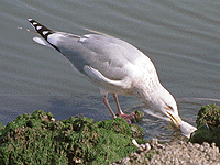 昼御飯を済ませてから、勝島運河を目指して立会川沿いに下ってゆく。 浜川橋まで来たら旧海道を少し北に戻り、家並みを抜けて堤に上がる。 その途端に鼻を突く物凄いどぶ臭さ。白く濁った水面にはたくさんの オイルボールが浮いている。さらには下げ潮に取り残されて、護岸の コンクリートにこびり着いているものも多い。昨日の雨のせいだろう。 それでも天気が良くて暖かいから、散歩がてら堤を行き交う人も多い。 堤の桜こそまだ咲いていないものの、花街道の菜の花はもう真っ盛り。 気を取り直して北へ向って歩いてゆくと、久し振りに金黒羽白の小群。 10羽ほどいるだろうか。水際に集まっていたけれど、近くへ寄ると 沖の方へ逃げ去ってしまう。尾長鴨に混じって緋鳥鴨の姿もちらほら。 けれど沙魚の子はほとんど見当らず、鮫洲の船溜りの鋼矢板の仕切の 手前まで来てやっと数尾の姿が見つかった。汚い水に躊躇いながらも たも網で掬ってみると、入ったのは微倫吾の子と泥目の子が2尾ずつ。 微倫吾の子よりも泥目の子の方が一回り大きい。成魚では泥目の方が 遥かに大きくなるから、同じ頃に孵化しても成長は早いかも知れない。 鮫洲の船溜りの端で百合鴎の群れに紛れ込んだ背黒鴎を眺めていたら、 「京浜運河の野鳥通信」のcanalbirdさんが登場。ここぞとばかりに 先日の大背黒鴎と鴎ではないかと思われる写真を見てもらう。けれど 水面に浮かんでいる姿では、背中の色はともかく脚の色までは判らず、 しかも夕刻の写真では嘴の色も不鮮明で、残念ながら結論は持ち越し。 そうこうしているうち1羽の背黒鴎が水際の石積みの上に降り立った。 珍しいなどうしたんだろう…と思ったら、どうやら水際に流れ着いた 鰡の死骸がお目当てらしい。けれどすぐには食べ始めることができず、 これまた目敏く寄って来た嘴太烏と睨み合い。やがて根負けしたのか 嘴太烏が去ってしまうと、やっと安心したのかがつがつと啄み始めた。 ![]() |
