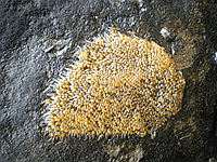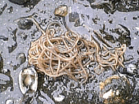 13:00頃に管理小屋の下に着いて、広場から干潟保線区を見渡す。 けれど野擦りの姿は見当らない。さすがに今日は場所を変えたかな…。 そのまま管理小屋を訪ねてOさんと話し込む。その後15:00頃に しおじ磯へ降りてみると、潮は土留めのすぐ下まで引いている。あれ? 今日の潮高は70cm近くあったと思うけれど、こんなに大きく引くの? だったらたも網や馬鹿長を用意して来るんだったなぁ…と悔やんでも 後の祭りで仕方が無い。すぐ気を取り直し、干出部で石を起してみる。 すると程なく見つかった泥目の卵。まだ産みつけられたばかりらしく、 透明感の無い濃い黄色で先端が赤い紡錘形。無論、眼は現れていない。 蚯蚓沙魚は番が一組だけ見つかったけれど、卵は見つけられなかった。 |
