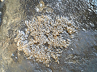 昨日は気温が20℃半ばに達し、3月どころか4月並みの陽気となった。 今日は雲が多くて陽射しは少ないけれど、それでも気温はかなり高い。 その影響は水にも現れているようで、12:15にしおじ磯へ着いて 測ってみると水温は16℃強もある。手に触れても冷たくないばかりか、 袖捲りをしていても寒さを感じない。ちなみに塩分濃度を測ると2.4%。 冬の間は石の下でじっと過ごしていた玉黍も、これだけ暖かくなると ぞろぞろ這い出して、石の表面に足の踏み場も無いほど集まっている。 土留めの辺りで石を起してみると、既に眼も現れた泥目の卵が1ケ所、 番も一組だけ見つかった。蚯蚓沙魚は単独の♀ばかり4尾。番や卵は 見つからなかった。蚯蚓沙魚も泥目も土留めの辺りで産卵するものが 年を追うごとに減っているような気がする。気のせいならいいけれど。 ●しおじ磯 16℃強 2.4% 泥 目 1尾 卵あり未計測 泥 目(番)1組 (♂115,♀110)mm 蚯蚓沙魚 4尾 63mm2尾,61,62mm各1尾 |