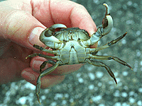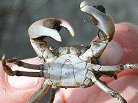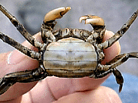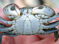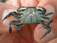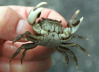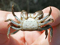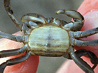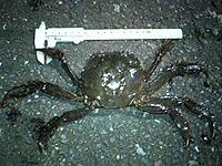昼過ぎの下げ止りで潮高は59cm。この潮高なら土留めの先まで潮は 引くだろうと思っていたのに、11:55にしおじ磯へ着いてみたら、 どうやら潮の引きが弱いらしく、土留めの上面がまだ潮を冠っている。 バカ長を穿いて立ち込み、水底を網で曳いてみたけれど何も入らない。 土留めの辺りで石を起してみたけれど、泥目も蚯蚓沙魚も見つからず、 仕方無いので月曜日の夜に捕まえた磯蟹の写真を撮ったりして過ごす。 ●しおじ磯 13.5℃ 2.7% |