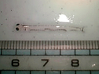 昨晩は雨になってしまったけれど、今夜は何とか持ち堪えそうなので、 22:40には埠頭の南へ。下げ止りまではまだ1時間ほどあるから、 網を曳く前にまず北側の護岸の手前、瓦礫の積っている所で毛房系の 蟹を探してみる。1つ1つ瓦礫を起して30匹ばかり見つけたけれど、 鋏を見るとどれも高野毛房磯蟹。ここも高野毛房磯蟹ばっかりかぁ…。 下げ止りが近くなったら、いつもの範囲で網を曳き始める。網の目に ちらほらと醤蝦がへばりつく。醤蝦に紛れて何か隠れてはいないかと、 指で選り分けながら目を凝らす。するといるいる、透明な沙魚の子が 次々と見つかる。大きさは2cmそこそこだから、網の目をすり抜けて 落ちるものも数多い。模様が判り難いけれど、見た感じは微倫吾かな。 さらに良く見てゆくと、木の葉のような形の透明な稚魚が見つかった。 あ、真子鰈の子だ。やっと現れたかぁ…。大きさはまだ2cm足らずで、 2月の末でまだこの大きさと言うのは、成長が遅いように感じられる。 もっとも、その冬に初めて現れる真子鰈の子は、いつもこのくらいの 大きさだから、遅いのは成長ではなくて産卵の時期なのかも知れない。 微倫吾の子と真子鰈の子はたくさん入るものの、それ以外はと言うと 今一ぱっとしない。洲走りが4尾に姫沙魚が3尾、真鯒に江戸沙魚に 足白沙魚が1尾ずつ。そして真子鰈の子とほぼ同じくらいの大きさで、 眼が普通に頭の両側にあるものが1尾。ややずんぐりしているものの、 口の大きな顔つきは見覚えがある。勢子の子と言うか鱸の稚魚らしい。 規定の5往復を終えたら、10年前からずっと砂地の同じ場所にある コンクリートの塊に腰掛けて結果を確認。わさわさ入った沙魚の子は、 体側の上下に茶色い破線状の模様がある。やっぱり微倫吾の子かぁ…。 ただし、茶色い破線が他のものよりも細かいように感じられるものも 何尾か見られる。微倫吾のようで微倫吾でない…となると肉沙魚かな? ●埠頭の南 14℃ 1.8% 姫沙魚 3尾 33,40,60mm 江戸沙魚 1尾 50mm 足白沙魚 1尾 28mm 微倫吾 多産 13〜15mmが中心 真 鯒 1尾 80mm 勢 子 1尾 20mm 洲走り 4尾 32mm2尾,33,37mm 真子鰈 10尾 14〜18mm 18mm5,16mm3尾 結果の確認が終っても、潮はまだあまり上がって来ていない。そこで 久し振りに排水溝の出口の水溜りを探ってみることにする。この冬は 数年振りで砂に埋まった水溜りも、今夜は排水溝の出口を中心にして 半径2mほどの半円形。擂鉢のように中心部に向って深くなってゆく。 流れ込む水はほぼ淡水で、溜った潮との境目にもやもやが生じている。 水底を芥ごと浚うと魚少ばかり9尾。そのうち3尾は頬の白点が粗く、 沼魚少のようにも見える。毛房系の蟹も3匹ばかり網に入ったけれど、 鋏の毛房は内側と外側がほぼ同じ大きさで、腹に黒い点は見当らない。 つまりいずれも高野毛房磯蟹と言うこと。ここも高野毛房磯蟹ばかり となると、京浜運河の周辺には毛房磯蟹はいないってことだろうか…。 ●排水溝の出口の水溜り 13.5℃ 0.5%未満(流れ込む水の数値) 魚少 6尾 40〜65mm 沼魚少 3尾 58,62,73mm |