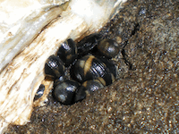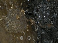 もう雨水だと言うのに再び雪が降るような天気予報が出ていたけれど、 うっすら筋雲が出ていてそよそよ吹く北風が冷たいものの、概ね晴れ。 10:00前になぎさの森まで来ると、融け始めは早かったようでも、 まだあちらこちらに雪が残り、折れた枝が散乱している。かなり太い 幹が折れている樹もあって、改めてかなりの大雪だったことが窺える。 観察舎で暖を取ってから、12:00にしおじ磯まで降りる。汀線は 棒杭の手前7m。土留めの上面がやっと干出したばかりで、土留めの 手前にもまだ潮が残っている。水温と塩分を測ってから、取り敢えず 立ち込んで石の下を蹴り込んでみる。ぽつりぽつりと高野毛房磯蟹が 入るばかりで、他にこれと言ったものは入らない。何だかしらけ気味。 棒杭の周りの砂底を網で浚っているうち、やっと白太蝦と指長筋蝦が 1匹ずつ入ったけれど、どちらも小さくてせいぜい3cmほどしかない。 下げ止りが近付いてきたら、土留めの前後で干出部の石を起して行く。 卵を守っている泥目が2尾。1尾はまだ卵が新しく、もう1尾は卵に やっと眼が出始めたところ。卵を産みつけた石が小さいせいだろうか、 どちらも石の下に壷のような穴を掘っている。さらに単独でいた♂の 泥目が1尾、番も1組…と思ったら、番ではなくて♀が2尾。1尾は 腹が膨れているけれど、もう1尾は細い。産卵済みか或いは未成熟か。 ここまで蚯蚓沙魚が見当らないと思っていたら、土留めより数m上で ♀ばかり4尾。どれも腹が膨れているけれど、最も大きいものですら 7cmちょっとしかない。この冬の蚯蚓沙魚は小さめの印象が拭えない。 一通り干出部を見て回ったら汀線の近くまで戻り、貝殻の積った所を 見て歩く。香櫨園川雲雀貝に混じって浅蜊や猿頬貝がぽつりぽつりと 打ち上げられている。大きな石に付いた霰玉黍は、相変らず同じ所に 同じ格好で付いている。けれどその下にもう1つ新たなものが現れた。 ●しおじ磯 16℃ 2.9% 蚯蚓沙魚 3尾 66,6771mm 全て♀ 泥 目 5尾 ♂106mm1尾,♀100,102mm 卵有り未計測2尾 |