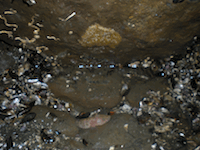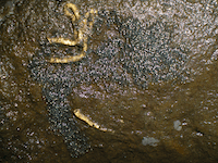 元日の賑やかさも漸く落ち着きを取り戻し、23:45にしおじ磯へ。 ほんのりと北から流れて来る空気を感じるけれど、この程度ならほぼ 無風と言っても差し支えはあるまい。空を見上げれば星影がちらほら。 この辺では最大限の見え方だろう。オリオン座がまだ左に傾いている。 潮の引きはまずまずで、汀線は棒杭よりも2m先。先ずは立ち込んで 石の下を蹴り込んでみたり、砂底を網で浚ってみたり。けれど幸先は あまり良くなくて、魚少と沼魚少が1尾ずつ入っただけ。蝦も少ない。 続けて汀線の辺りを手始めに、干出部の石を起して行く。程なくして 石の裏にびっしり産みつけられた、何かの卵が見つかった。親の姿が 見当らないのは、逃げられたらしい。汀線に触れている石だからなぁ。 見た感じでは蚯蚓沙魚の卵。もう眼が現れていて孵化が近そうな感じ。 ![]() そのすぐ後で、泥目の番が一組。まだ卵を産んでおらず、♀は早々に 逃げてしまった。♂には悪いことをしちゃったなぁ…。さらに続けて 石を起して行くと、今度は♂の泥目が1尾。石の裏には卵がびっしり。 眼どころか稚魚の形までくっきりと現れて、見るからに孵化も近そう。 ![]() こうなると蚯蚓沙魚も泥目も、年末に産卵を始めていたことは確実で、 昨年の魚少の産卵はやや遅れ気味だったけれど、この冬の蚯蚓沙魚や 泥目の産卵は特に早くも遅くもないらしい。とは言え、今後の動向は 気に掛かる。何しろ今夜の水温はこの時期になってまだ17℃もあるし、 塩分も2.8%しかなく、水がまだ冬になっていないような感じがする…。 さて、石を起しながら少しずつ汀線を離れ、土留めの辺りまで来ると 蚯蚓沙魚が3尾。どれも顔付きは細く♀らしい。腹も膨れ気味だから まだ産卵する前かも知れない。それにしては最も大きいもので7cmと、 やや小振りな感じがする。まだ完全に成熟していないのかも知れない。 そうなると蚯蚓沙魚の産卵は、やはり遅れ気味と思えなくもないなぁ。 ●しおじ磯 17℃ 2.8% 泥目(番) 1組 (♂115mm,♀未計測) 泥目(卵) 1ヶ所 蚯蚓沙魚 3尾 61,67,70mm 蚯蚓沙魚(卵)1ヶ所 魚少 1尾 45mm 沼魚少 1尾 67mm |