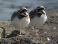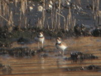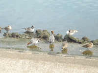 吹く風はまだ冷たく感じられるけれど、しおじ磯の南端ならその風を 観察壁や木立が遮ってくれるので、日差しさえあれば言うことは無い。 10:00過ぎに着いて壁から覗き込むと、お立ち台の石積みの上に 鵤千鳥が3羽。寛いでいるものと見えてちょこまか動き回らないから、 デジスコで狙うにはまたと無い絶好の機会。急いで機材を組み立てる。 ![]() 観察壁からお立ち台くらいの距離だと、鵤千鳥が良い感じの大きさで 画面に収まってくれる。けれど撮れた画像はと言えば、どれもこれも ぶれていたり焦点が甘かったり。なかなか思うような画像が撮れない。 またと無い絶好の機会であっても、腕が伴っていなければ意味が無い。 やがて一斉に飛び立った鵤千鳥が、石積みの向うの干潟へと降り立つ。 そうなると思うように合わない焦点が、ますます合わなくなってくる。 しかもちょっとした振動でぶれてしまう。絵にはなるんだけれどなぁ。 そもそもちょこまか走り回るから、視野に収めるだけでも一苦労する。 大きくてゆったりと動くものであれば少しは焦点も合せ易いだろうと、 奥の波打際にいる大鷺や蒼鷺を撮ってみる。けれどあまり変わらない。 こうなれば場数を踏むだけと、電池が切れるまで鵤千鳥を追いかける。 |