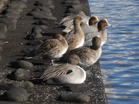 一昨日の節分は4月上旬並みの暖かさ。今日も天気は好く、日差しを 浴びていると暖かい。09:30頃に鮫洲の勝島運河を通りがかると、 総勢10羽のこぢんまりとした鴨の群れ。そのうちの7羽が尾長鴨で 3羽が緋鳥鴨。すっかり潮に浸かった護岸の最下段を前に、2段めの 端に上がり込んでほぼ横一列に並び、のんびりと日差しを浴びている。 ![]() ここまで近寄っても逃げないのかぁ。緋鳥鴨も人に慣れて来たのかな。 |