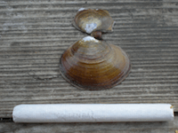 09:30頃に夕やけなぎさへ立ち寄る。青い空には雲一つ見当らず、 日差しが暖かい。北風さえ吹かなければ、もう春そのものと言う感じ。 棒杭のすぐ先の水面に鈴鴨が群れているけれど、旅立ちも近いのかな。 何をしようと思って来た訳でもないから、道具も何も持ってはいない。 ただぷらぷらと北寄りの砂地を歩く。汀線から棒杭まで20mくらい あるだろう。それでも干出している高潮帯には、打ち上げられた貝が 線を成している。それをぼんやりと眺めながら、往ったり来たりする。 特に注意して見ていた訳ではないけれど、それでも歩いているうちに 風変りな貝が見つかった。色艶は大和蜆に似ているけれど、大きさが まるで違い殻幅が5cmくらいある。一方が突き出た殻は姫白鳥貝にも 似ていると言えば似ている。もしかしたらこれって磯蜆じゃないかな? ![]() 探せばまだ見つかるかとさらに見て歩く。すると明らかに磯蜆と判る 殻幅が5cmもあるようなものは見つからなかったものの、ぽつぽつと 見つかった大和蜆の中に幾つか、妙に殻高の低いものが混じっている。 殻の一方が突き出ているように見えなくもないし、殻の膨らみがやや 弱いように見えなくもない。磯蜆の幼貝か、それともただの大和蜆か。 ![]() 鈴鴨の群れは相変らず棒杭の先の水面に浮かんだまま。大半は背中に 首を埋めて静かに寝ている。けれど時おり大きな♂がばしゃばしゃと 激しく羽撃いては水飛沫を跳ね上げ、その静けさを破ったりしている。 |